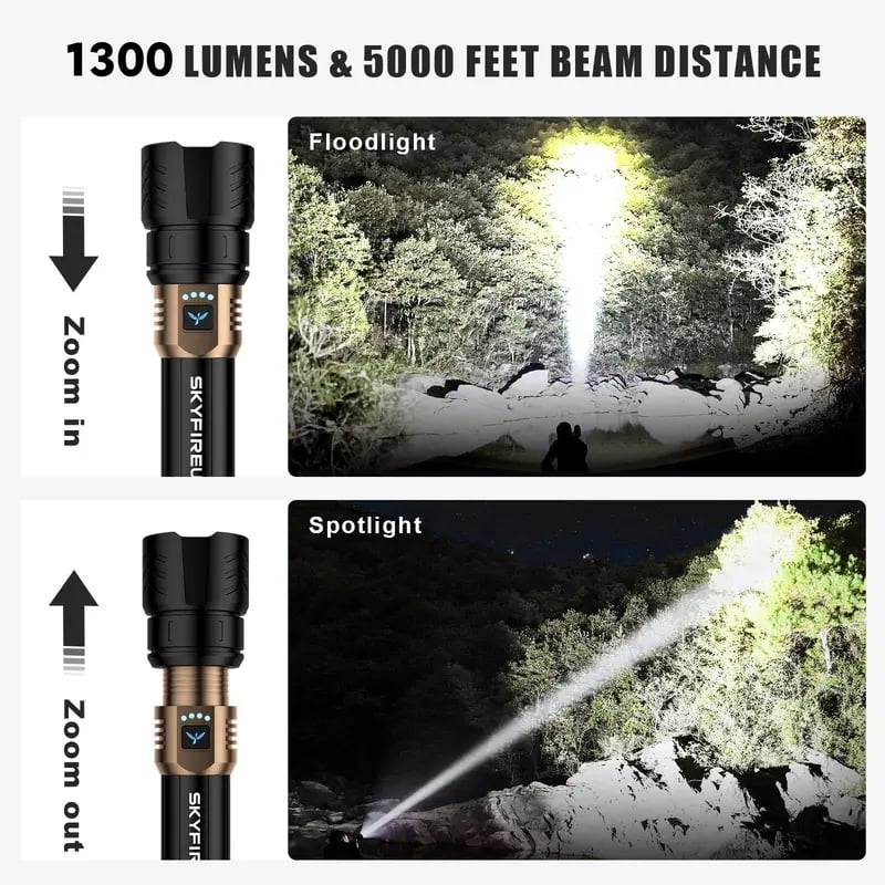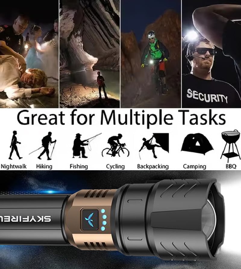 🌟SKYFIRE 1097 Flashlight: Your Ultimate Lighting SolutionPowerful PerformanceThe SKYFIRE 1097 flashlight boasts a strong light range of over 900m, perfect for long-distance projection. It features a 4000mAh battery, offering an endurance of 4-16 hours.
